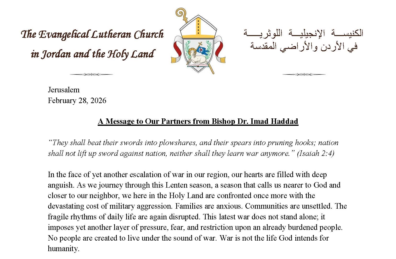 A Message to Our Partners from Bishop Dr. Imad Haddad