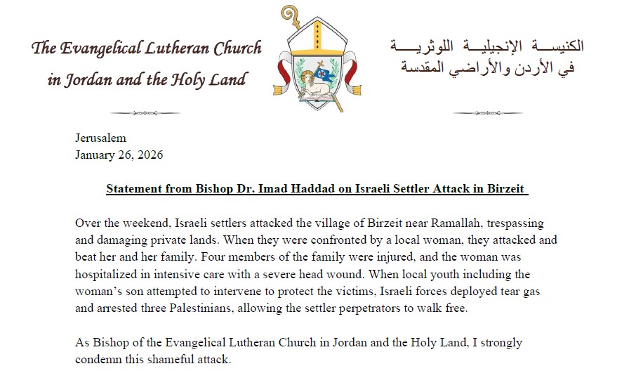 Statement from Bishop Dr. Imad Haddad on Israeli Settler Attack in Birzeit